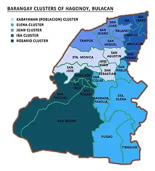 Hagonoy is politically subdivided into 26 barangays grouped into 5 clusters or kumpol for statistical purposes. All barangays are classified as urban by the Philippine Statistics Authority. Each barangay consists of puroks and some have sitios.