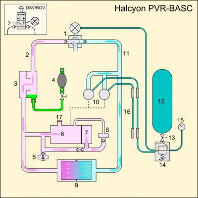The Halcyon Passive, Variable Ratio-Biased Addition Semi-Closed rebreather is a unique design of semi-closed rebreather using a depth-compensated passive gas addition system.[1] Passive addition implies that in steady state operation (at a constant depth) addition of fresh feed gas is a response to low volume of gas in the loop - the gas is injected when the top of the counterlung activates a demand type addition valve, which provides feed gas as long as the diver continues to inhale. The mechanism discharges gas to the environment in proportion to breathing volume to induce this gas feed.