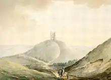 - "As we were now on our departure from Haldown on the descent of its northern extremity, we had before us a triangular tower raised by Sir Robert Palk and devoted to the memory of his friend General Lawrence. It had a round tower at each angle and rose three stories high. From its own elevation and that of the conical hill on which it was placed it became an object to the most distant parts of the county; it is hardly possible to conceive a spot better adapted to an edifice of this nature than this of Pen Hill, denominated so by the Britons on account of its eminence. I took the opposite sketch from the road from whence the pine-clad hill and the tower were seen in great perfection".