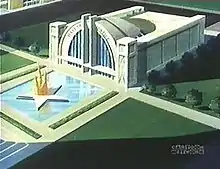 Gmuer apparently modeled the fortress after the art deco Union Terminal in Cincinnati, Ohio, a train station turned museum.[10][11][3] Gmuer "sketched out a building that almost resembled the finished product", and gave the sketch to the network, "where it was turned into the Union Terminal look-a-like that's known today".[3] Like the Union Terminal, the facade of the Hall of Justice is a monumental semicircle, with a half-circle of windows divided vertically by mullions, and a horizontal marquee running the length of the beneath the windows. This is flanked by square towers, equal in height to the dome (unlike the much shorter flanking elements of the Union Terminal). Cincinnati was also where Hanna-Barbera's corporate parent of the time, Taft Broadcasting, happened to be based. Gmuer later commented of the animated Hall of Justice: "In the long run, I hated that building...The way it's designed, it was not easy to draw. I had nightmares about that damn building".[3][1]
