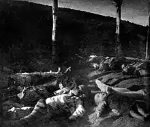 What I myself saw this Friday afternoon [November 1] is forever engraven on my mind as the most horrible sight a man can see. I went with one of the cavasses of the English Legation, a soldier, my interpreter, and a photographer (Armenian) to the Gregorian [i.e., Armenian Apostolic] Cemetery ....Along the wall on the north, in a row 20 ft (6 m) wide and 150 ft (46 m) long, lay 321 dead bodies of the massacred Armenians. Many were fearfully mangled and mutilated. I saw one with his face completely smashed in with a blow of some heavy weapon after he was killed. I saw some with their own necks almost severed by a sword cut. One I saw whose whole chest had been skinned, his fore-arms were cut off, while the upper arm was skinned of flesh. I asked if the dogs had done this. "No, the Turks did it with their knives." A dozen bodies were half burned. All the corpses had been rifled of all their clothes except a cotton undergarment or two....To be killed in battle by brave men is one thing; to be butchered by cowardly armed soldiers in cold blood and utterly defenseless is another thing.[28]