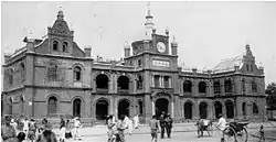 The station was first built in 1906 as a stop along the Jiang-Shu railway (江墅铁路), and at that time was called "Qing Tai Men Station" (清泰门站). It was opened on 23 August 1907 as the railway was put into use.[3] Because the station was hundreds of meters away from Hangzhou City at that time, the residents inside the city found it inconvenient. Thus, Ma Yifu (马一浮), a scholar returning from America, suggested the station move into the city. The building of the in-town station started in 1909 and was completed the following year. In 1937, the Sino-Japanese War began. The station was bombarded twice in October by the Japanese, and Hangzhou was occupied on 24 December. During the Japanese occupation in Hangzhou, the station was rebuilt from 26 March 1941 to 21 March 1942.