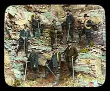 Christian Almer, (1826-1898), who planned to celebrate his golden wedding anniversary with an ascent of the Wetterhorn, asked Kaufmann to serve as porter. So on Friday 20 June 1896, Almer (age 70), his wife Margaretha (age 71), his eldest daughter, two sons (Peter and Hans), the village physician (Dr. Huber), a photographer, Hans Kaufmann, and another porter left Grindelwald, spent the night at the Gleckstein hut, and rested the following day.[6] On Sunday, soon after midnight, the group left the hut, "arriving just hours later on the summit . . . A high wind and intense cold prevented a long or convivial stay, but the weather was otherwise good and Almer's friends in Grindelwald could see the party being photographed on the summit."[7] "Gritli" (née Margaretha Kaufmann in 1824) was a distant relative of Hans Kaufmann.