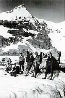 However, Hans Kaufmann's most successful climb, together with his brother Christian and Herschel Clifford Parker (1862-1936), on 21 July 1903, was the first ascent of Mount Hungabee,[20] "a magnificent peak, for many years considered almost impossible, is probably the most difficult and dangerous summit ever ascended in Canada."[21] Parker later commented that they also climbed Mount Temple from Moraine Lake, where "Hans Kaufmann most kindly and ably assisted me in my scientific observations for the determination of altitude."[22] Parker and August Eggers (1862-1936), led by Hans, also made first ascents of Mount Deltaform and Mount Biddle.