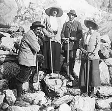 In June 1928, Lady Ruby Florence Mary Baring and her daughter Rosemary Baring were Kaufmann's clients for a climb of the Jungfrau. Kaufmann gave Rosemary, who had not really climbed before, "a few lessons in rock climbing during their week in Grindelwald."[60] Having given her daughter into the charge of Kaufmann during the climb, Lady Cromer praised him, for "not only has he inspired her with every confidence, which I fully share, but . . . together with his amazing style and wise experience, has helped her to benefit to the full by his kindly tuition." The twenty-year-old Rosemary shared her mother's enthusiasm for Kaufmann's instructive skills: "He is so kind and encouraging and gives one such confidence in his great skill and strength that I am looking forward to climbing many more peaks under his guidance."[61] She was not able to do any further climbs with Kaufmann, but she became active in alpine clubs and travelled to Canada in 1930 to climb Mount Mary Vaux (Maligne Lake group), Mount Tupper (Silkirks), and Mount Edith Cavell with Noel Ewart Odell and Colin Grant Crawford.[62][63] In recognition of her achievements, the Royal Geographical Society (London) made her a member.[64]