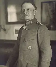 In September 1915, Gronau was appointed to command of XXXXI Reserve Corps, swapping places with Generalleutnant Arnold von Winckler. The corps was upgraded to form Armee-Gruppe Gronau on 20 September 1915. Gronau remained in concurrent command of the corps and the Armee-Gruppe. It served as part of the Army of the Bug throughout its existence. On 18 September 1916 the command was upgraded to form the Armee-Abteilung Gronau.[2] It remained on the Eastern Front until dissolved on 27 March 1918.[3]
