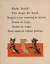 - ↑ "Hark! Hark1 The Dogs Do Bark". mamalisa.com. Lisa Yannucci. Retrieved 19 December 2017. A 19th-century example, with an illustration by Kate Greenaway, is Mother Goose, or the Old Nursery Rhymes. London: Frederick Warne. 1881. p. 9. ISBN 9781582180465.