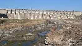 ![]() Outlet structure of Harlan County Dam, seen from downstream | |