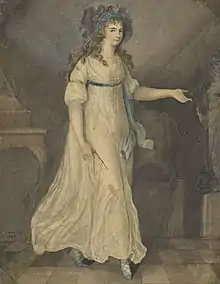 During her stays in Florence and Rome she was involved in artistic activity. Apart from copying Old Masters in galleries she also produced landscape paintings and some large scale portraits. She acquired a reputation for portraits and in Florence her style changed and reflected her interest in antiquity. She painted British visitors to Florence and Emma, Lady Hamilton in 1792 as well as Georgina, Duchess of Devonshire in 1793.[5] Much of the information about her paintings came from letters but in October 2005 an album of portraits produced in 1791–94 went on sale at Christie's South Kensington. The estimate for the sale of the 43 portrait studies in the album was £3,000 to £5,000 and the price realised was £16,800[12]