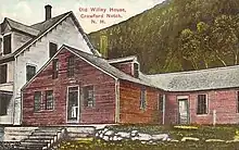 The obscure Indian trail transformed into the Coös Road, on which was built a small public house in 1793. It was abandoned, but in 1825 Samuel Willey Jr. occupied it with his wife, five children, and two hired hands.[7] During a violent storm on August 28, 1826, they all died in a landslide known as Willey's Slide. They fled their home and took refuge in a shelter, but it was destroyed while the house remained unscathed. A rock outcrop uphill divided the slide, which flowed around the home and reunited below it. The door was found gaping, a bible open on the table. Their tragedy inspired the short story "The Ambitious Guest" (1835) by Nathaniel Hawthorne, and Mount Willey was named in their memory. The house became part of a larger inn, then burned in 1898. Today, the location is a state historic site.[8]