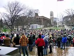 Before cannabis legalization in Michigan, the penalty for cannabis law violations in the City of Ann Arbor was a $30 fine and $25 court costs for a total of $55, and was a civil infraction ticket.[4] The campus falls under state, not city jurisdiction but "for decades, police had in the past exercised discretion and a general tolerance for public marijuana use at the annual Hash Bash. Marijuana is openly consumed annually on the campus and at past events, few, if any, arrests occur. There is a general understanding that during this time, peaceful protesters can engage in the civil disobedience of cannabis consumption and police generally will not enforce state law."[5]