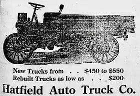 - ↑ "Planning To Build Auto Delivery Cars, The Hatfield Company Being Organized Here". The Marion Star. Marion, Ohio. 1909-11-10. Retrieved 2020-05-05.
