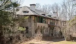Hathaway, also known as V. Everit Macy and Edith Carpenter Macy Estate, is a historic estate house located at Tannersville in Greene County, New York. The house was built in 1907 and designed by architects Delano & Aldrich. It is a large, two story rectangular residence surmounted by a hipped roof with deep overhanging eaves and exposed rafters. It is constructed of concrete block coated in stucco. Also on the property are a carriage house, solarium, garage, and shed. A fishing cabin was once situated on the pond of the property, but is no longer standing.[2] Hathaway was previously run as a Bed and Breakfast lodge, with prominent Broadway actress Maude Adams among its guests.