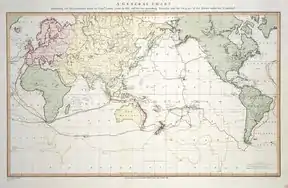 In 1748, Anson published a redrawn version of the captured chart in A Voyage Round the World,[7] one of the best-selling books of its day.[8] Anson's chart showed the Pacific to be relatively barren, but the three voyages of James Cook would add significant detail.[9]