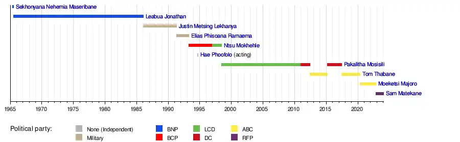 A total of seven people have served as Prime Minister of Lesotho (not counting one Acting Prime Minister and two Chairmen of the Military Council). Additionally, three persons, Ntsu Mokhehle, Pakalitha Mosisili and Tom Thabane, have served on two non-consecutive occasions.