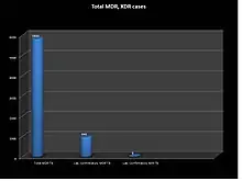 Drug resistance: When micro-organism of TB causes resistance to isoniazid or/and rifampicin the most effective drugs of TB. If the organism causes resistance against both of the drugs then it is called multi-drug-resistant tuberculosis (MDR-TB). In 2017 the estimated number of MDR was 8400, among them 5800 cases was notified and 944 patients were confirmed by laboratory test and 920 patients started immediate treatment. If any patient develops resistance against isoniazid/rifampicin and one of the 2nd line antibiotic fluoroquinolones (i.e. amikacin, kanamycin, or capreomycin), it's called extreme drug resistance tuberculosis (XDR-TB). In 2017, 6 patients were confirmed XDR-TB by laboratory diagnosis and all of them started treatment instantly. As 31 December 2017, countrywide a total 6420 MDR-TB patients were enrolled for treatment including 920. Among 920 patients, 425 patients were in 24 month regimen and 495 patients were 9 months regimen[17][16]