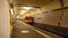 Following the fall of Berlin, the U-Bahn was closed at the end of April 1945. Service resumed at Neanderstraße on 3 June that year.[7] Mitte was within the Soviet zone which became East Berlin; the station was renamed Heinrich-Heine-Straße on 31 August 1960 following a decision by the Berlin Magistrat on 22 July to rename the street. After the construction of the Berlin wall a year later, on 13 August 1961, U-Bahn trains on Lines C and D (U6 and U8) no longer stopped in East Berlin and Heinrich-Heine-Straße became one of the ghost stations. The entrances were blocked up and the stairwell enclosures removed so that they were no longer visible. Use did not resume until German reunification almost 30 years later, on 1 July 1990. East Berlin U-Bahn stairway enclosures were built in early 1990 for the entrances from the street.[8] Because of the long closure, the station retains much of its original appearance: 3 platform kiosks, direction indicators, nameplates (black with white lettering on this line; Grenander believed this made them easier to read[1]), wooden poster frames, and wrought iron exit gates.[3]