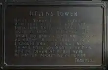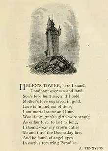 The best known of these poems is Lord Tennyson's Helen's Tower. Lord Dufferin persuaded Tennyson to write it in 1861.[19] The poem is known in several versions. The text given in the present article (framed) is the one displayed on a metal plate in the tower. Slightly different versions were published in 1884 in the Good Words magazine[20] and in 1885 in Tiresias and Other Poems.[21]