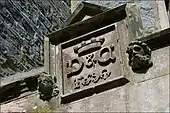 The entrance to Helen's Tower is in a porch that occupies the re-entrant between the base of the square tower and that of the stair tower on the eastern side. The porch has a hipped roof built of lapped (feathered) sandstone courses. The entrance door opens to the south and is surmounted by a square datestone sheltered by a hood mould. The stone shows a coronet, an aristocratic cypher ("monogram") and the year 1850.[9] The coronet has four balls as befits a baron. The cypher shows two opposed uppercase Ds and an ampersand between them (D & Ɑ). A similar device appears on the gable of Helen's Bay railway station (1863) where however the two Ds are interlaced to form a proper monogram rather than a cypher. The description of Helen's Tower on the historic building list says the cypher is short for Dufferin and Ava,[10] interpreting the second D as a lowercase A. However, this cannot be as the coronet is a baron's, the year is 1850, and the marquessate of Dufferin and Ava would only be created in 1888. The Dufferin Memorial Hall in Bangor, built in 1905, shows a very different DA monogram for Dufferin & Ava.