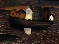 Houses on A Barge | Medium: Oil on canvas Dimensions: 16 x 21 in. (40.6 x 53.3 cm) Creation date: 1929[16] |
