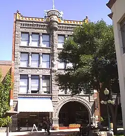 Helena was initially founded in the downtown section. On July 14, 1864 four miners, dubbed the "Four Georgians" (though only one was from Georgia), discovered gold in a creekbed along what today is Helena's downtown main street, Last Chance Gulch.[4] This sparked a cultural and building boom that lasted 30 years and Helena became the state capital. The city grew from south to north along Last Chance Gulch, its main street, and hence the evolution of architectural styles can be traced. At the southern end the road is narrow with small log and stone buildings and at the northern end the road is wider and has large stonework homes.[3] Few major downtown buildings were built in the years immediately after the Panic of 1893, which among other problems, caused the closing of the local silver mines.[5] This resulted in downtown Helena having a sharp division in its older and newer sections.[3] Most of the newer buildings were small, had a single function, and had a false front. At the time of the initial 1972 NRHP nomination, some of the significant buildings that still stood from that early time were: the Electric and Power Blocks, Helena Athletic Association, Auerbach Buildings, Merchants Hotel (later Monticello Apartments), Atlas Block, Diamond Block, the Wheat Building (Merchants National Bank Building) and the Lewis and Clark County Courthouse.[3] A major fire in 1928 affected the area, destroying many original buildings, including the Granite, Bailey, Gold, and New York Store blocks.[6] Additional buildings in the downtown section were damaged or destroyed in the 1935 Helena earthquake.[3]