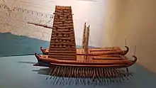 Naval helepolis. Two quinqueremes having a helepolis on their decks.