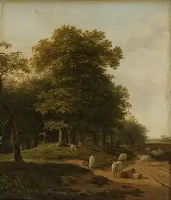 He traveled to paint in Belgium in 1824 and in Germany in 1834.[2] In 1840 he became one of the early members of the Arti et Amicitiae artists society in Amsterdam. In 1841 he traveled along the Rhine river in Germany with his pupil Willem Roelofs.[2] He also painted landscape scenes from Noorden and the area around Oosterbeek, an artists' colony that later became known as the Dutch Barbizon. He was an active teacher and continued to take in pupils until shortly before he died.[8] Some of these pupils, notably Ter Meulen became pupils of Hendrikus' son Julius upon his death.[9] Even after his death, Hendrik's work continued to be displayed prominently in the family studio where his artist son and daughter painted.[8]