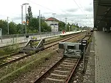 Hennigsdorf is a railway station in the Oberhavel district of Brandenburg, located in the town of Hennigsdorf. It is the northern terminus of the S-Bahn line S25 as well as a station for regional passenger trains and freight services.