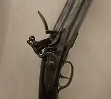 James Wilson came to Nock in 1779 to make the prototypes for his volley gun design. Nock won the subsequent competitive bid for the production of the gun. The weapon is consequently commonly referred to as the Nock gun. Nock also produced some volley guns and volley pistols for the civilian market but in very small numbers. This included a set of these weapons for the Royal Household which is still in the Queen's collection today.[14] This set is not standard production. It has, for instance, silver mounts by Mark Bock, a London silversmith.[15]