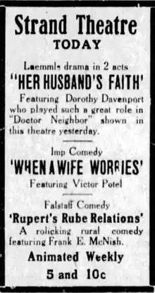 - ↑ "Movie Ad for Stand Theatre". The Arkansas City Daily News (Arkansas City, Kansas). June 10, 1916. p. 6. Retrieved November 24, 2021 – via Newspapers.com.