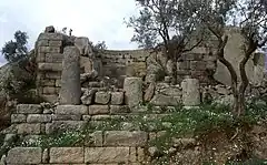 On a rocky eminence immediately west of the agora stands the temple of Athena, one of the few structures in the city not aligned with the grid.[6][3] The temple, for which a date in the early 3rd century BC has been suggested, measures 9 m × 17 m, and has a simple plan consisting of a cella, a deep pronaos (nearly as deep as the cella), and two Doric columns in antis on the front. The facade was marble, but the rest of the building was constructed of the same local gneiss that was used for most of the city's buildings and its fortifications. The walls of the cella still stand to a height of over 7 m.[11]