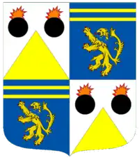 Quarterly: 1st & 4th per chevron Argent and Or in chief two fire balls Sable fired Proper (Hardy); 2nd & 3rd Azure a lion rampant Or gorged with a ducal coronet of the field in chief two barrulets of the second (Cozens).