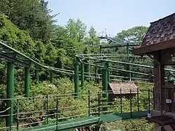 The coaster initially goes up a lift hill, then falls slightly to the left. It then falls down another time, goes right, then left and right again and returns to its station.[6] The coaster has two trains with ten cars per train, with two riders across per row, and thus can have 20 riders per each run.[5] Herky and Timmy's Racing Coaster's tracks are 1030.2 ft long and made of steel, and the ride runs for 1.02 min.[5] The coaster is themed after The Tortoise and the Hare, an Aesop fable,[5] due to its location in Aesop's Village.[4] The ride initially went forwards, but starting from December 2019 to February 2020, the rollercoaster went backwards as part of Everland's New Year's Day event.[7] Herky and Timmy's Racing Coaster was the first roller coaster in South Korea to go backwards.[7] The rollercoaster currently continues to go backwards after the New Year's Day event.[8]