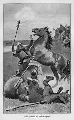 Hestavíg was an entertainment activity during the Viking Age in the Icelandic Commonwealth (930–1262), presumably a sport consisting of a brutal and bloody confrontation between two stallions, egged on by their masters, which mainly served to choose the best specimens for breeding.[1] It was a cultural event of great importance and sometimes behaved verbal and physical confrontations among the spectators. The triumph of a champion or the other could impact socially and politically in the pacts and alliances between goði (chieftains) and bóndi (homesteaders), as testified in the Norse sagas.[2] The site where these battles held was a neutral place used to strengthen friendship or treat issues among rivals. It was also an opportunity for courtship between young couples.[3] Sometimes rivalries raised among participants and ended in bloody conflicts.[4] Some examples appear in the Njáls saga (chapter 59) and Víga-Glúms saga (chapters 13-14).[5]