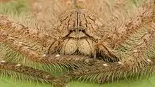 They are sexually dimorphic and body length ranges from medium to large: the male 15.3–18.2 millimetres (0.60–0.72 in); the female 21.3–25.3 mm (0.84–1.00 in).[2] Males have an overall reddish brown dorsum with distinct brightly colored hairs forming patches and lines. The body has short dense hair, prominently interspersed with long bright orange hairs. The posterior half of body has a distinct red line surrounded by red hairs. The pedipalps are black, and the legs lack any distinct pattern. Females are similar to males, but the female's dorsum coloration may vary from greyish to reddish brown. Their legs are annulated with dark spots on bright regions, and there is a prominent triangular patch on the venter between the epigastric furrow and spinnerets.[3]