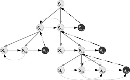 Illustration of the structure of a HHMM. Gray lines show vertical transitions. The horizontal transitions are shown as black lines. The light gray circles are the internal states and the dark gray circles are the terminal states that returns control to the activating state. The production states are not shown in this figure.
