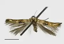 The wingspan is 6โ8.5 mm. The forewings are creamy white, with scattered yellowish brown scales, ochreous yellow from the dorsal two-thirds along the dorsum to the apex. There is a trapezoidal ochreous yellow patch extending from between the costal one-third and two-fifths to between the dorsal one-fourth and half. There is an inverted triangular ochreous yellow patch, extending from between the costal three-fifths and four-fifths to the lower angle of the cell, bearing an ill-defined black dot posteriorly, with a narrow silvery grey band placed along its outer margin. The dorsum has an ovate dark blotch located between the basal one-fourth and two-fifths, consisting of tufts of shining purple grey scales, its anterior margin crossing two-fifths the width of the wing. Near its inner side is a black spot. The hindwings are greyish brown.