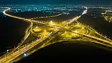 High-mast lights in conjunction with shorter lampposts at the Tainan System Interchange (Chinese: 台南系統交流道) in Sinshih District, Tainan, Taiwan