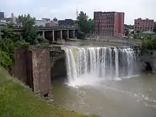 The High Falls are a waterfall on the Genesee River in the city of Rochester, New York. They are one of three waterfalls within the city; the Middle and Lower Falls are about 2 miles (3.2 km) downstream. The High Falls area was the site of much of Rochester's early industrial development, where industry was powered by falling water. Brown's Race diverts water from above the falls and was used to feed various flour mills and industries; today the water is used to produce hydroelectric power.[1]