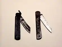 A higonokami (肥後守) is a type of folding pocket knife originating in Miki, Hyōgo Prefecture, Japan in 1896. The knife has no locking system, but is a friction folder or "penny knife",[1] using the friction of the swivel or the pressure of the user's thumb on its iconic lever or chikiri, to prevent the knife from folding during use. The handle of the Higonokami is made of a folded over sheet of metal. The handle is stamped with the name of the maker of the knife and the steel used in the blade. A distinguishing feature is that the blade has a flat grind without a secondary bevel.