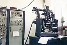 Amongst other devices, the Camden location produced PDP-8 computer-driven X-ray diffractometers in the mid-late 1960s, one of which is believed to be still functional at Oxford University Chemistry Dept. in 2017. Development began with a linear diffractometer[5] in the late 1950s - early 1960s but this was superseded around 1965 by the Y290, a four-circle diffractometer,[6] the electronics for which were developed at the University of Manchester by Prof David B.G. Edwards (Computer Science)[7] along with Owen S. Mills (Chemistry).[8] The early models (actually referenced Y230) used a Ferranti computer for controlling the diffractometer but, due to reliability issues, the cheaper and more compact PDP-8 became the computer of choice for the Y290 model. One of the production engineers claimed that the electronic research department in Camden (headed by Arthur Long) had PDP-8 No 4 from Digital Equipment Corporation (DEC), so Hilger and Watts was likely to have been one of the first PDP-8 customers. The book ‘Single Crystal Diffractometry’[9] by U.W. Arndt and B.T.M. Willis (C.U.P., 1966) has photographs and other excellent diagrams showing the construction of these machines; both authors were involved in their development. The four-circle diffractometer was originally designed for neutron work at the Atomic Energy Research Establishment Harwell Laboratory but it became better known in field of X-ray crystallography. Photographs showing prototypes of both instruments may be seen in a review article by U.W. Arndt.[10] For commercial production of the four-circle diffractometer, Hilger and Watts won two Queen's Awards to Industry, the first for Services to Export in 1966 and the second for Technological Achievement in 1968.[11] In the late 1960s the cost of the four-circle system was around $130,000.
