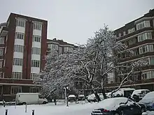 The architect for the flats (and the cinema) was Thomas Bennett; he also designed the block of flats on nearby Finchley Road, above what is now a Waitrose store. The practice he founded continues today. His design for Hillfield Court provided 113 flats over six storeys, in seven different layouts and intended to suit a variety of tenants. Bennett had given much thought to the planning of apartment buildings for London.[4] At Hillfield Court, he adopted the 'dining-hall' in some layouts, for more efficient use of the available space. A boiler room provides hot water to all flats and heating to common parts. Originally there was a central store for tenants' own coal, carried up by porters to be burned on the open fires. From its inception Hillfield Court was considered a prestigious block, not least because of its fine, spacious gardens.