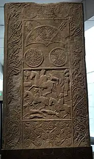 The Hilton of Cadboll Stone is a Pictish cross slab that was found near the Hilton of Cadboll Chapel. The stone was carved around 800 CE and stayed on site until it was removed in the 1860s.[3] The Cadboll stone likely stood in a small, semicircular subject on the gable of the western side of the chapel until it was moved.[1]