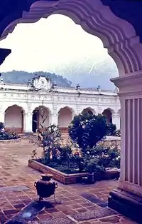 The city was laid out in a square pattern, with streets running north to south and from east to west, with a central square. Both church and government buildings were designated important places around the central plaza.[10][Note 1] Between 1549 and 1563, property southeast of the square was sold to the crown and occupied by the first president of the Real Audiencia de los Confines: the lawyer Alonso Lopez Cerrato, who also served as governor and captain general.[10][Note 2] The original building was small and paneled with portal, tile roof, and adobe walls. The city is surrounded by three enormous volcanoes and mountains, plains and hills. This territory was called Valley of Guatemala and had 73 villages, two towns and the city of Santiago de los Caballeros.[11]