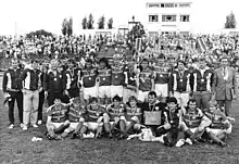 BFC Dynamo then met SG Dynamo Dresden at home on the 24th matchday on 26 May 1979. BFC Dynamo was now five points ahead of second-placed SG Dynamo Dresden, with three matches left to play. BFC Dynamo won the match 3–1 in front of 22,000 spectators at the Friedrich-Ludwig-Jahn-Sportpark and finally captured its first title in the DDR-Oberliga. Wolf-Rudiger Netz, Michael Noack and Frank Terletzki scored one goal each in the match.[40] The 17-year-old forward Rainer Ernst from the youth department made his debut for BFC Dynamo in the DDR-Oberliga away against BSG Chemie Böhlen on the 25th matchday on 6 June 1979. The team defeated BSG Chemie Böhlen 3–10.[41] BFC Dynamo then defeated FC Karl-Marx-Stadt 3–1 at home on the last matchday on 9 June 1979. BFC Dynamo had managed an astonishing 21 wins, four draws and only one loss during the league season. The team had scored a total of 75 goals during the season and thus also set a new record for the number of goals scored during a season in the DDR-Oberliga under the current format.[18][nb 1] The previous record of 70 goals for the current format was set by SG Dynamo Dresden in the 1975-76 DDR-Oberliga.[18][nb 2] Hans-Jürgen Riediger became the second-placed league top goal scorer with 20 goals.[43] Peter Rohde retired from his playing career after the season. He was registered in the squad at the beginning of the season but did not play any matches for the first team during the season.[9][44]