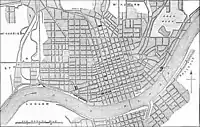 In February 1815, the Kentucky General Assembly incorporated the land as the town of Covington.[1] At the time of its incorporation, Covington and all of today's Kenton County was a part of Campbell County. Shortly after its incorporation, the investors began selling lots in the new city for $385 a lot. However, for the next 15 years, lot sales were slow and disappointing. By 1830, the young city had a population of only 715 and lot prices were selling for half their value in 1815.