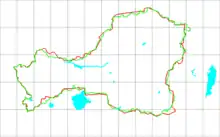 Red line - Tuva 1953 boundaries (before the 1958 Soviet-Mongolian territory exchange agreement). Green line - Tuva 2008 boundaries.