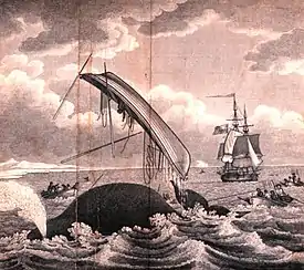 A number of New England towns were heavily involved in whaling, particularly Nantucket and New Bedford. Nantucket began whaling in 1690 after recruiting a whaling instructor, Ichabod Paddock.[18] The south side of the island was divided into three and a half mile sections, each with a mast erected to look for the spouts of right whales. Once a whale was sighted, rowing boats were sent from the shore. If the whale was successfully killed it was towed ashore, flensed (i.e., the blubber was cut off), and the blubber boiled in cauldrons known as "try pots". Even when whales were caught far offshore, the blubber was still boiled on shore well into the 18th century. New Bedford whaling was established when prominent Nantucket whaling families moved their operations to the town for economic reasons, and made New Bedford the fourth busiest port in the United States. In Herman Melville's novel Moby-Dick[19] the narrator begins his whaling voyage from New Bedford.