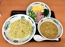 Hiyashi chūka (冷やし中華, literally "chilled Chinese") is a Chinese-style Japanese dish consisting of chilled Chinese noodles with various toppings served in the summer. It is also called reimen (冷麺, literally "chilled noodle") in Kansai region and hiyashi rāmen (冷やしラーメン, literally "chilled ramen") in Hokkaido.[1] Toppings are usually colorful cold ingredients and a tare sauce.