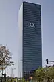 The building's glass facade wraps the structure of the building like a tensioned membrane. Circular ventilation elements in the form of individually opening windows enable natural ventilation and provide a reference to the outside world by making the background noise noticeable even on the upper floors. The tower with 50,200 m2 (540,000 sq ft) is flanked by four seven-storey buildings (approximately 8,525 m2 (91,760 sq ft) each) referred to as "campus" which are connected by a transparent roof. A fifth building houses 139 apartments.